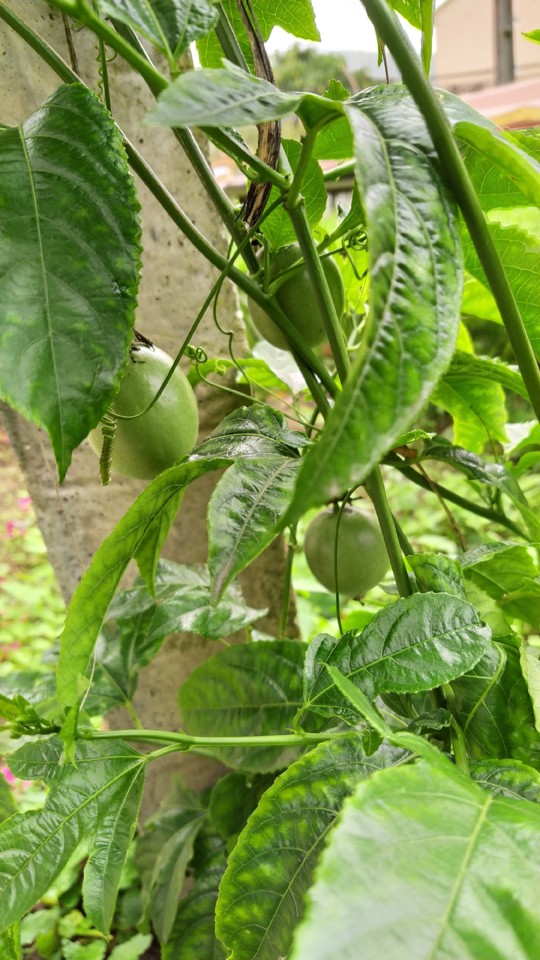 Os maracujás estão a crescer, a planta é pequenina, nasceu este ano, mas já tem vários.